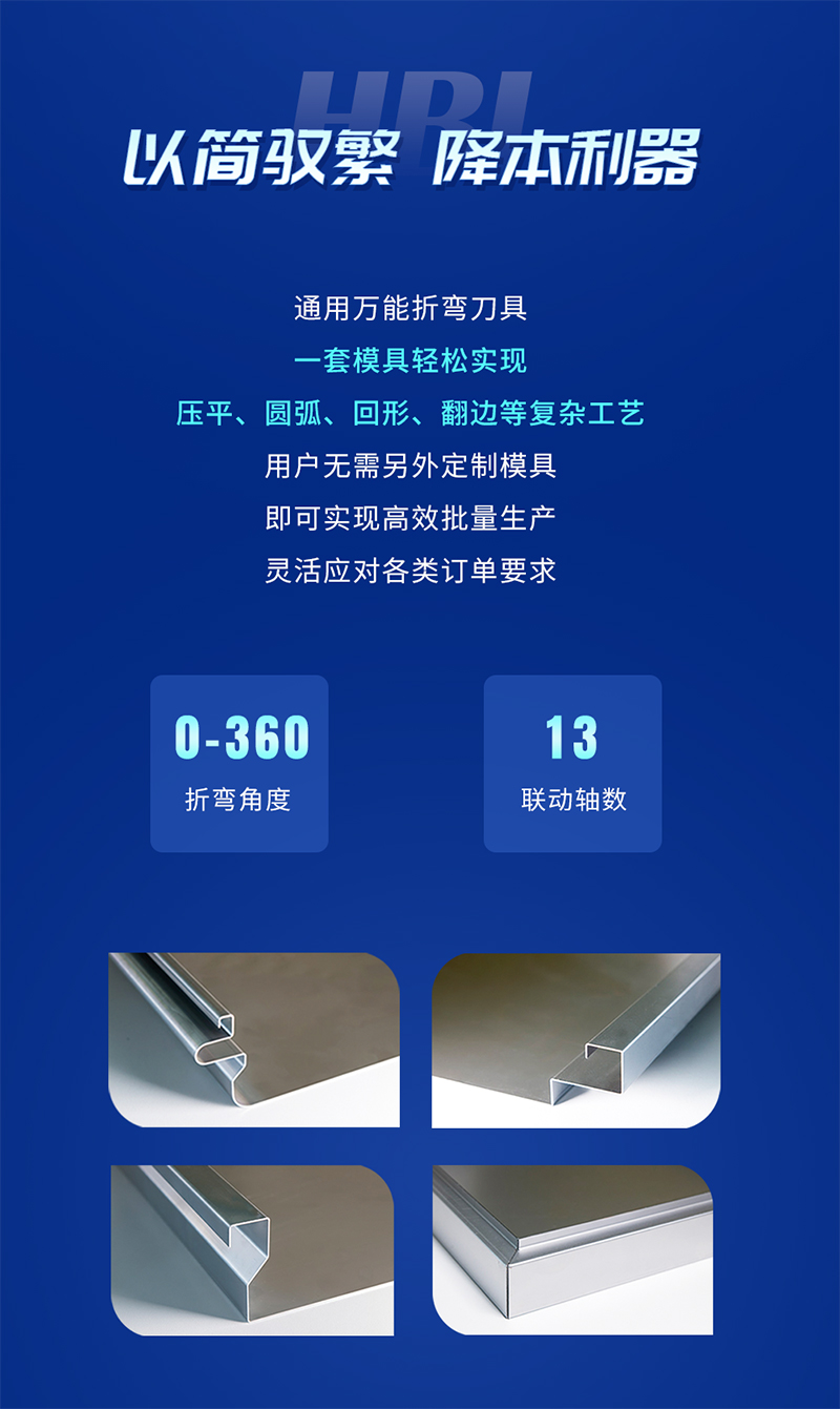 通用萬能折彎刀具,一套模具輕松實現(xiàn)壓平、圓弧、回形、翻邊等復(fù)雜工藝,用戶無需另外定制模具即可實現(xiàn)高效批量生產(chǎn),靈活應(yīng)對各位訂單要求。