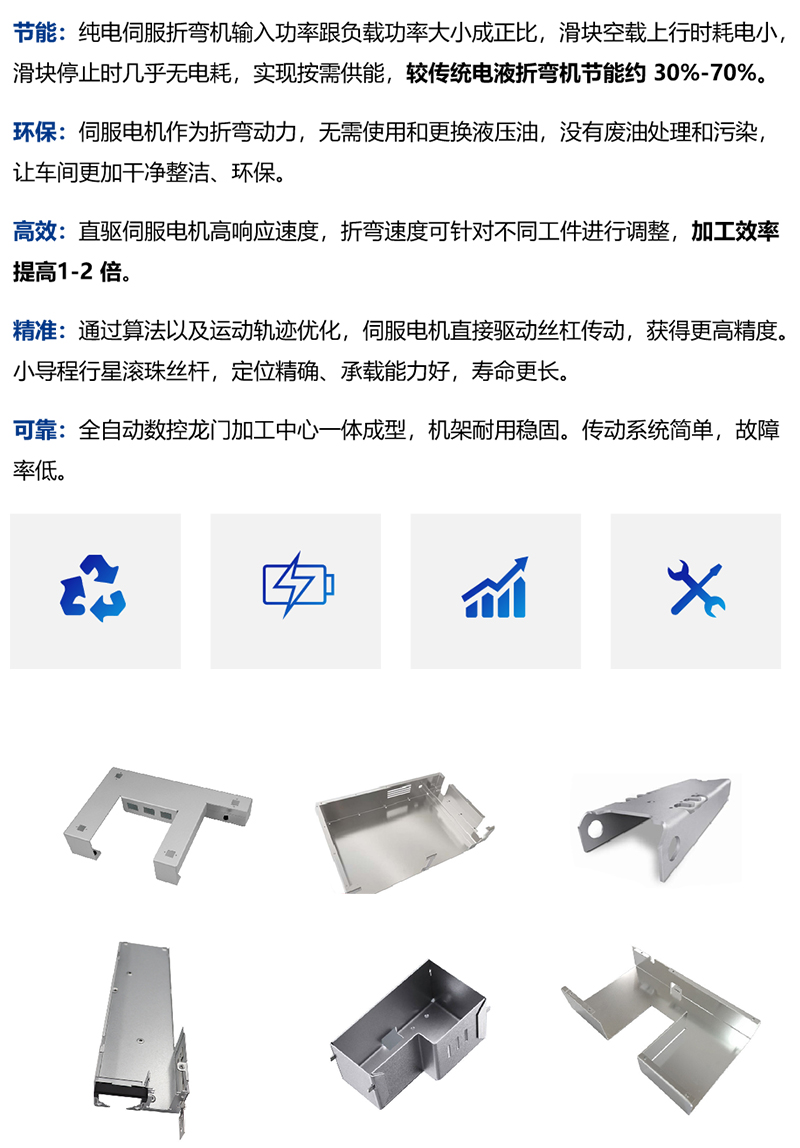 純電伺服折彎?rùn)C(jī)輸入功率跟負(fù)載功率大小成正比,滑塊空載上行時(shí)耗電小,滑塊停止時(shí)幾乎無(wú)耗電,實(shí)現(xiàn)按需供能,較傳統(tǒng)電液折彎?rùn)C(jī)節(jié)能約30%-70%,